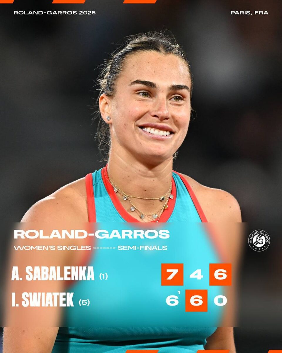 В полуфинале Открытого чемпионата Франции белоруска обыграла Игу Свёнтек — 7:6, 4:6, 6:0. Отметим, что полька проиграла свой первый матч на грунтовом турнире Большого шлема с июня 2021 года.