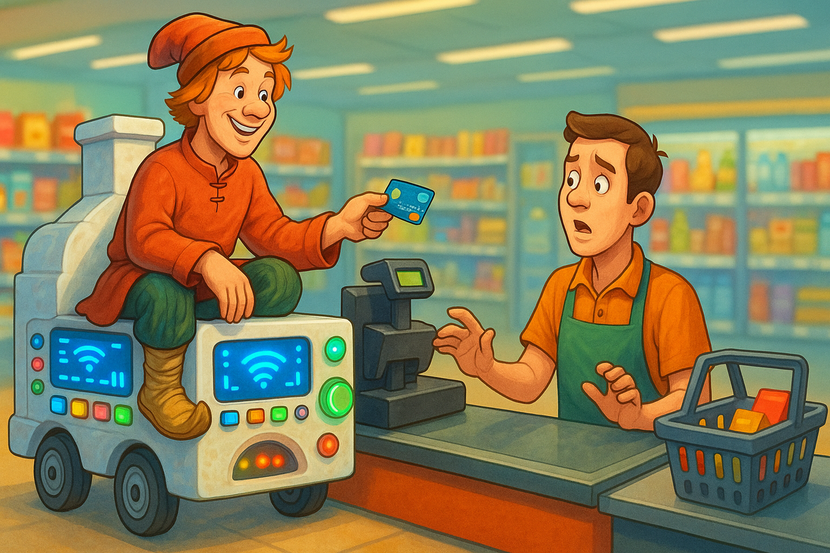 — Ну ладно, — вздохнул Емеля и подъехал на печке прямо к кассе. — Здрасьте. Оплатить по карте.