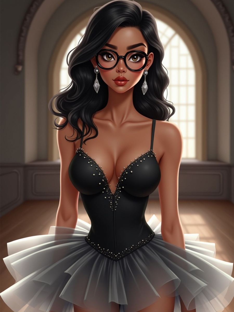 Балерина. Промпт: Изображение представляет собой цифровую иллюстрацию с изображением женщины в балетном наряде. На ней чёрный облегающий лиф с глубоким V-образным вырезом, украшенный изящными декоративными элементами, и объёмная многослойная пачка в оттенках серого и белого. У неё светлая кожа тёплого оттенка и длинные волнистые чёрные волосы, ниспадающие на плечи. На ней большие стильные очки в чёрной оправе и элегантные висячие серьги. Фон слегка размыт, что создаёт впечатление помещения с арочными окнами и приглушённым освещением, создавая изысканную и изящную атмосферу. Нейросеть: Leonardo. Preset: Flux. #нейросеть #красиваядевушка #брюнетка #цифровоефото #девушка #идеи #рисунок #цифроваяживопись #нейроарт #артыотнейросетей #aiwoman #DigitalDreamscapes #нейрофото #digitalart #leonardo #aiartwork #иллюстрация #балерина #очки #балет #арт #DIY #flux #ai