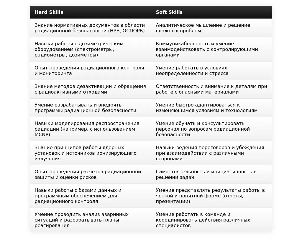 Пример: "Обладаю глубокими знаниями нормативных документов в области радиационной безопасности (НРБ, ОСПОРБ). Опыт работы с дозиметрическим оборудованием и системами радиационного мониторинга." (Соответствует требованиям профессии.)