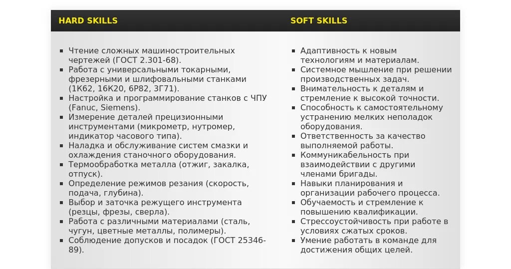 - Для вакансий на токарных станках: "Опыт работы на токарных станках", "Умение работать с чертежами и допусками", "Навыки нарезания резьбы".