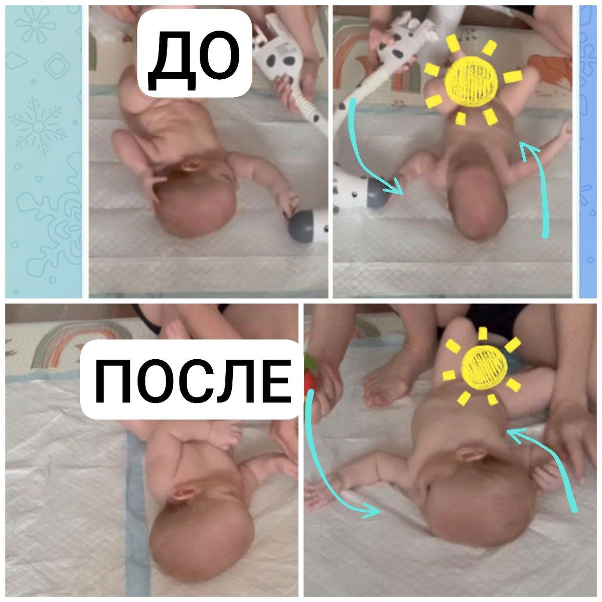 ДО ПОСЛЕ результат за 1 неделю выполнения упражнения: фиксация головы в повороте налево с перемещением предмета дальше ближе, по 2 минуты, 2 раза в день ДО ❗Голову не поворачивал налево ❗Правый бок не сгибался ПОСЛЕ ✔️Поворот головы влево на полный угол ✔️Сгибание правого бока в таком же объёме, как и левого