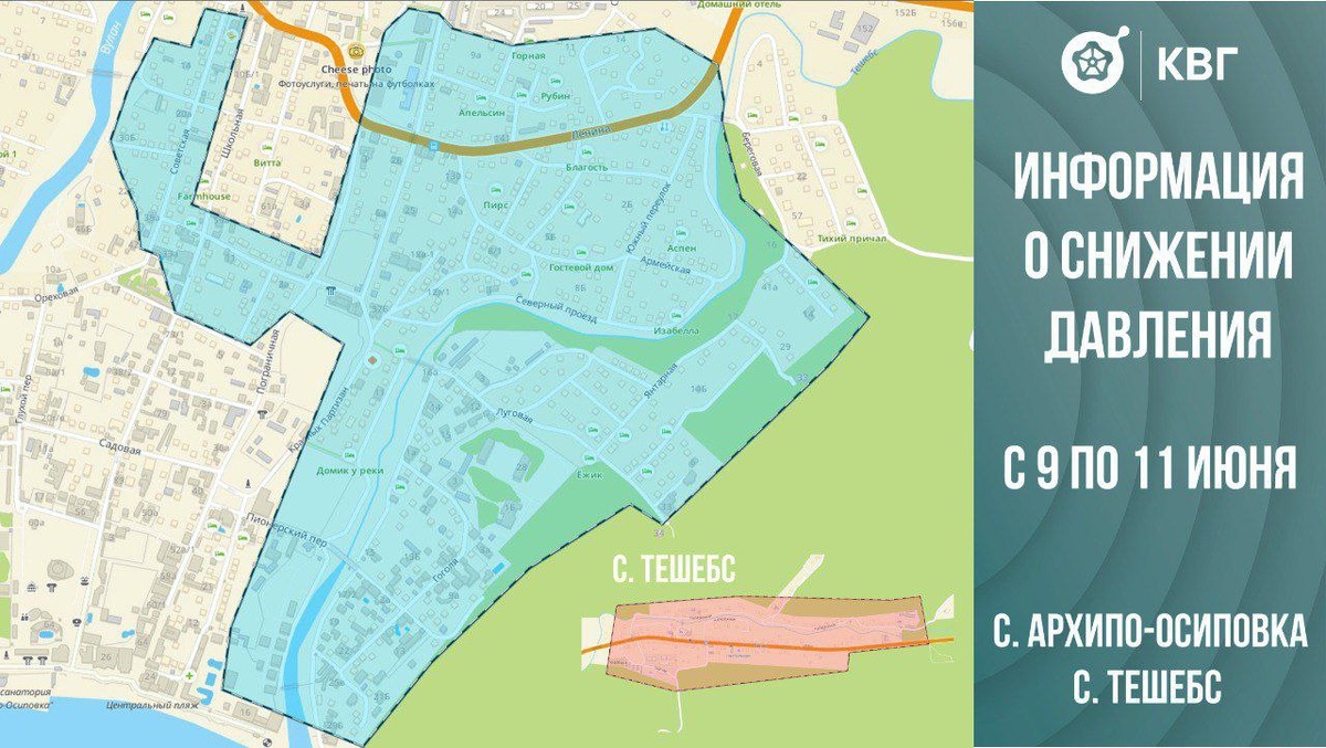 Уважаемые абоненты! Примите во внимание, что с 9 по 11 июня в сёлах Архипо-Осиповка и Тешебс подрядчиком будет проведён комплекс мероприятий по установке расходомеров. В связи с производством работ возможно снижение давления и кратковременные отключения. В зону снижения давления попадают районы улиц с. Архипо-Осиповка Советская, Красных Партизан, Ленина, Северный проезд, Гоголя, Янтарная, Луговая и другие (подробнее смотри карту). Кроме того, в зоне снижения давления село Тешебс. Благодарим за понимание. Телефон диспетчерской Архипо-Осиповки +78614160914 Источник: https://t.me/kvg_gel 🚀 Подписаться на Архипка Live 📥 Прислать фото, видео, новость