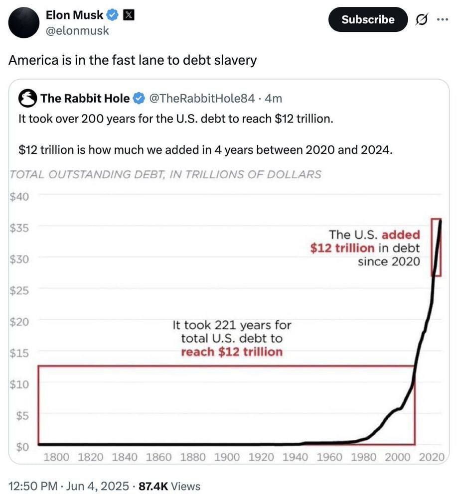 Илон Маск с прыгнул с корабля и активно начал критиковать власти: Америка стремительно движется к долговому рабству. Elon Musk verließ das Schiff und begann, die Behörden aktiv zu kritisieren: Amerika bewege sich schnell in Richtung Schuldsklaverei.