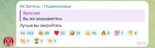 «Витязь» в телеграме отреагировал на слова болельщика о закрытии клуба, обратил внимание Спортс.