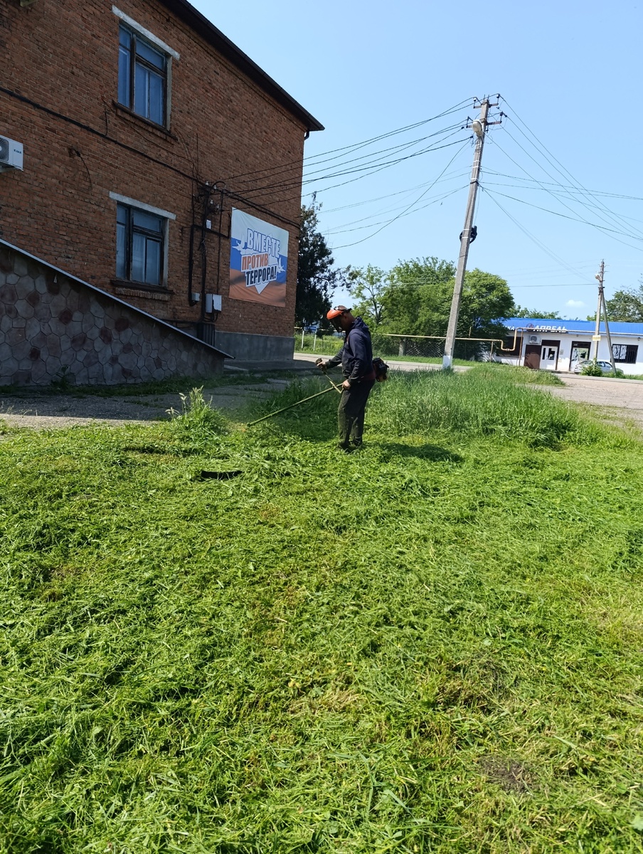 Работники администрации по благоустройству муниципального образования "Сергиевское сельское поселение" проводят покос травы на территории