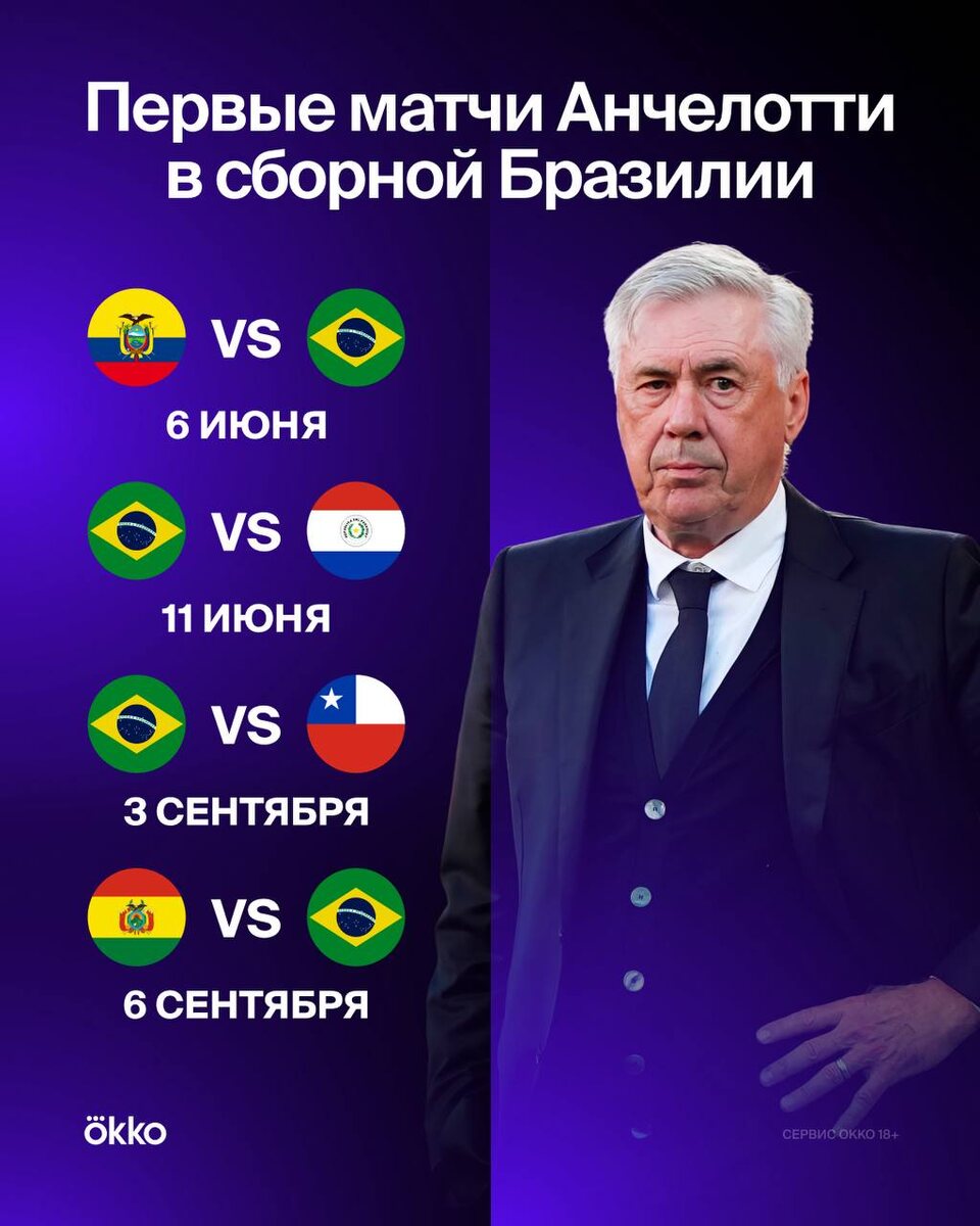 Сегодня ночью у Папы Карло будет первый матч во главе сборной Бразилии. Впереди отборочные игры ЧМ-2026 🏆 Сколько очков наберут бразильцы в этих встречах? Пиши в комментах! 👇