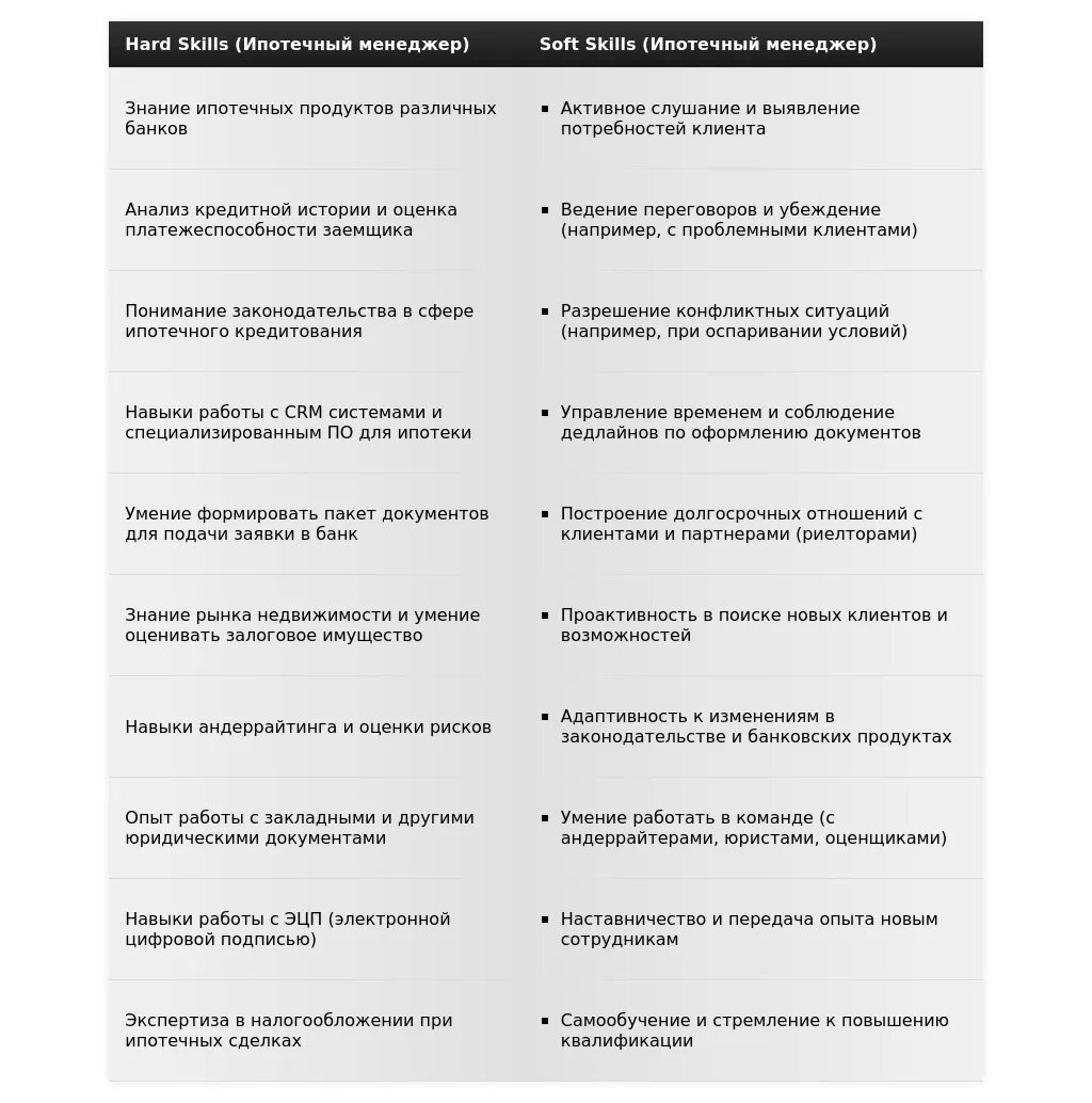 "Профессиональные навыки: Знание программ ипотечного кредитования (Сбербанк, ВТБ, Газпромбанк), MS Office (Word, Excel), опыт работы с CRM-системами. Личные качества: Коммуникабельность, стрессоустойчивость, ответственность."
