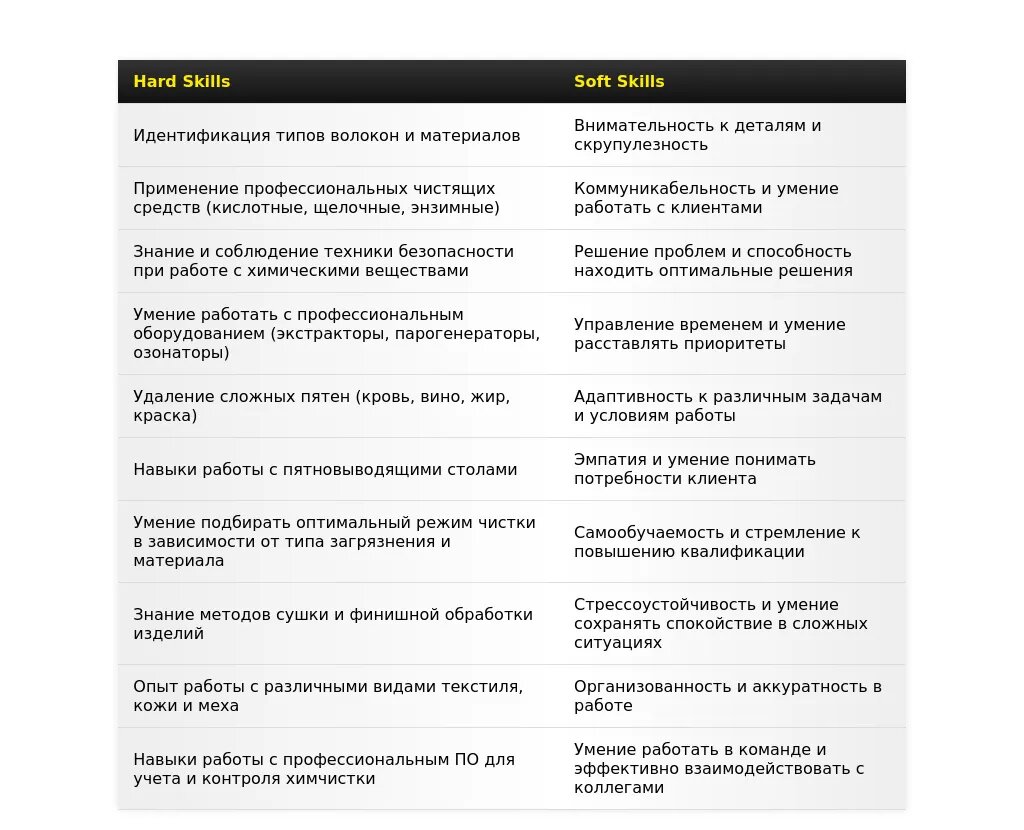"Профессиональные навыки: Аквачистка, сухая химчистка, пятновыведение (опыт работы с различными типами пятен), глажка текстильных изделий. Навыки работы с оборудованием: Пятновыводное оборудование, стиральные машины, сушильные барабаны, гладильные прессы. Личные качества: Внимательность к деталям, ответственность, аккуратность."