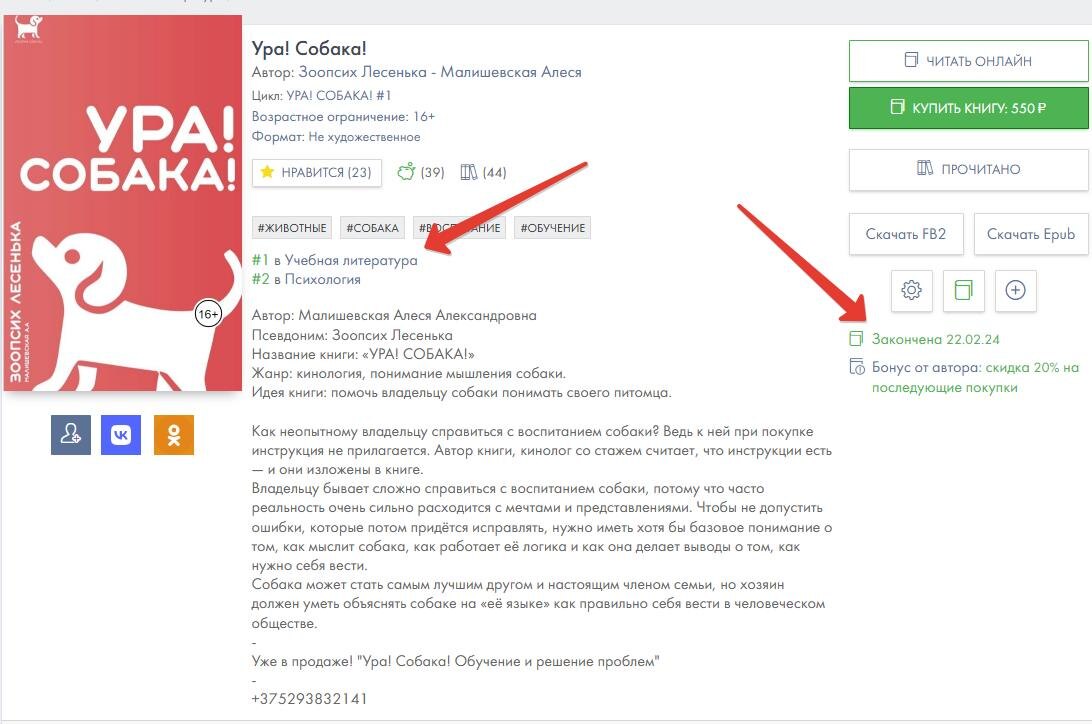 Прошло уже больше года, а мои книги по-прежнему занимают лидирующие позиции в своей категории и продаются. Честное слово, я не ожидала такого совсем. Думала, ну пока новые, то будет интересно и пару продаж будет, а потом как у всех: ниже ниже и в хвосте. Я их нигде не продвигаю, не даю рекламу... Только тут иногда рассказываю Вам о своих успехах, и на сайте они моём "висят" и всё. Первая книга для начинающих. Так сказать азы вообще всего. Эту книгу я реально выстрадала ))) Доооолго я не решалась её написать, потом дооооолго писала, а потом доооолго решалась... А потом... Эх, была не была! Мне всё казалось, да и сейчас кажется, что надо было ещё чего-то написать, и ещё что-то... Но уже есть как есть ) Радует то, что информация, которая содержится в ней, действительно помогает людям и их питомцам лучше понимать друг друга. Об это говорят отзывы и на сайте, и тут, и в разговоре. Но то, что книга до сих пор на первом месте, для меня всё равно загадка. Хотя это очень приятно. Глупо было б