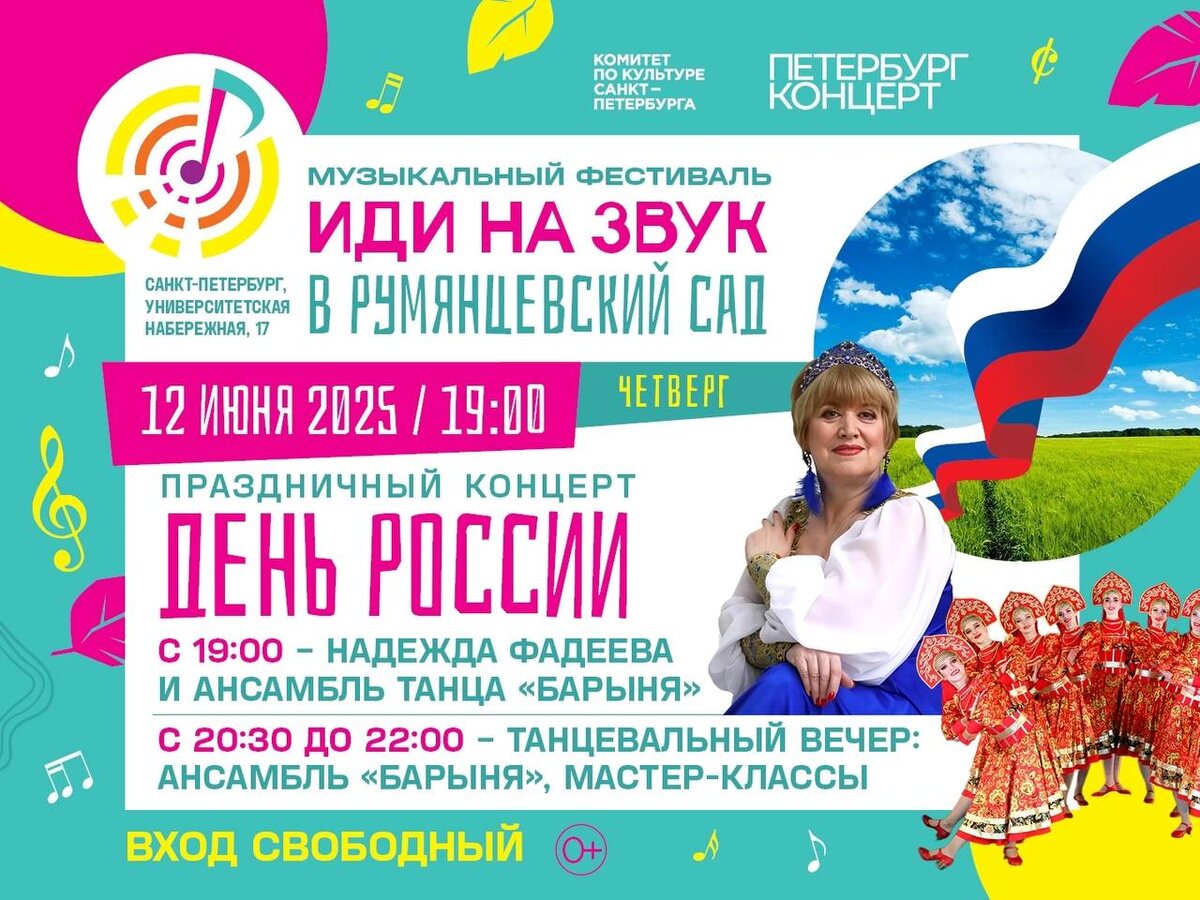 Празднуем День России вместе с Надеждой Фадеевой и ансамблем танца «Барыня» — 12 июня в Румянцевском саду на фестивале «Иди на звук!» С середины мая и до середины сентября каждый четверг по вечерам в Румянцевском саду будут проходить вдохновляющие, зажигательные и по-летнему теплые концерты самых популярных и любимых артистов, вокалистов и музыкантов Петербурга. 12 июня состоится особенная праздничная программа, посвященная Дню России, в исполнении Надежды Фадеевой и Государственного ансамбля танца «Барыня». По окончании концерта зрителей ждут танцевальный вечер и мастер-классы от ансамбля «Барыня» с 20:30 до 22:00. Вход свободный.