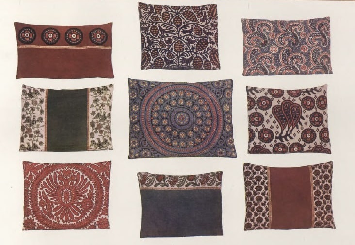 В этих вещах очень явственно наследование стилистике русской набойки XVII-XVIII вв. И дело не только и не столько в цвете, а в орнаментах. Подобные рисунки есть переосмысление русскими мастерами орнаментов венецианских и персидских тканей с учетом нашей локальной эстетики. В Ивановском музее ситцев и ГИМ сохранились оригинальные старые ткани с аналогичными рисунками. Орнамент русской народной набойки складывался под большим влиянием импортных тканей с Востока, в первую очередь из Ирана. Восточные корни можно заметить не только в набивших оскомину «огурцах», но и в полосатых тканях, напоминающих икат, и в бутонах гвоздик, популярным у персидских кустарей. Впрочем, развитие орнаментов и на западе Европы влияло на русскую стилистику. Зубчатые каплевидные цветки, встречающиеся как в набойке, так и в изразцах, схожи с теми, что ткали на венецианских бархатах XVII в. Спустя столетие уже мода французской элиты влияла на вкусы богачей и их предпочтения в рисунках на тканях. 🔸Чехлы д