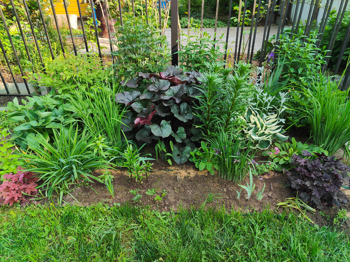 В моем угловом цветнике, которому отроду два года, сейчас пурпурный период. В основную часть цветника все растения пересаживались уже во взрослом состоянии, поэтому он не выглядит молодым, кажется, что здесь уже давно так было. А передняя часть делалась осенью прошлого года, она ещё полностью не заполнена, поэтому там ещё лысовато. В начале июня цветущих многолетников здесь пока мало. Первоцветы уже отцвели, ирисы и лилии ещё не зацвели. Поэтому главную скрипку сейчас играют декоративно-лиственные растения. Вот они-то как раз в пурпурных тонах. Центр цветника занимает бузульник зубчатый Бритт-Мари Кроуфорд. Он, собственно, и создаёт центральную точку композиции. Мне он очень нравится, я не встречала других сортов с такой насыщенной окраской листьев. Верхняя сторона листа зеленовато-пурпурная, а нижняя - багряная. Очень эффектно! Специально в пару к нему подбирались г.йх.ры. Бинош, мне кажется, идеальная партнёрша для бузульника. Она очень близка к нему по цвету, просто меньшего разме
