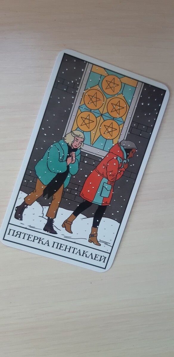 И как там говорят, в Таро просто девушки? Лиза Стерл? О женской красоте и силе, вдохновленная современной модой и ведьмами со всего мира? Ну, допустим. Это очень простая колода. А карта, пентакли, пять. Она про материальные заботы, бедность, холод, голод, препятствия, бесполезные расходы, долги, чрезмерные амбиции. У вас такого быть не должно. Любимый четверг, должен быть для вас прекрасен, удачный и успешный. Действуйте.