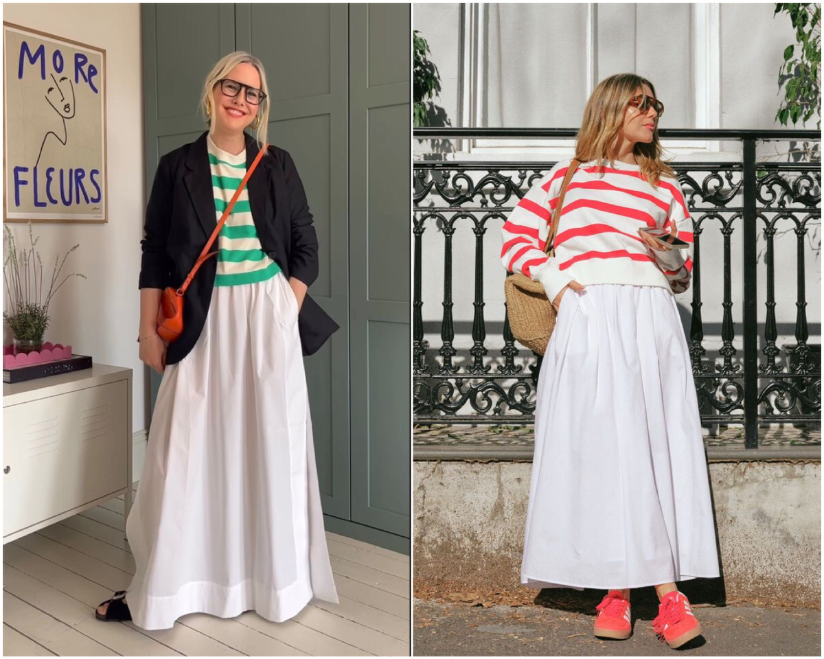 Взлет белой макси-юбки А-силуэта на модный олимп — эхо ностальгии по эпохе 70-х и 80-х, с их ретро-эстетикой и богемным шиком.