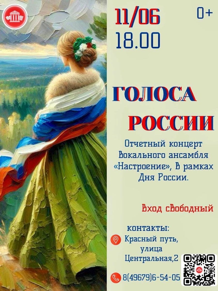 ✨ СДК «Русь» приглашает ☝️ «Голоса России» - отчетный концерт вокального ансамбля «Настроение» (рук. Жанна Колотий) Накануне Дня России подарите себе и своим близким хорошее настроение! 🌸 🚫 Возраст: 0+ 📆 11.06.2025🕒18:00 🏢 Сельский дом культуры (СДК) «Русь» 📍 г.о.Домодедово, с.Красный Путь, ул.Центральная, д.2 💰 Вход свободный❗️ ✅ Мероприятия Домодедово https://dzen.ru/id/66f10385cc4c5a16f7b5fb02 http://vk.com/domodedovo_events http://dzen.ru/domodedovo_events