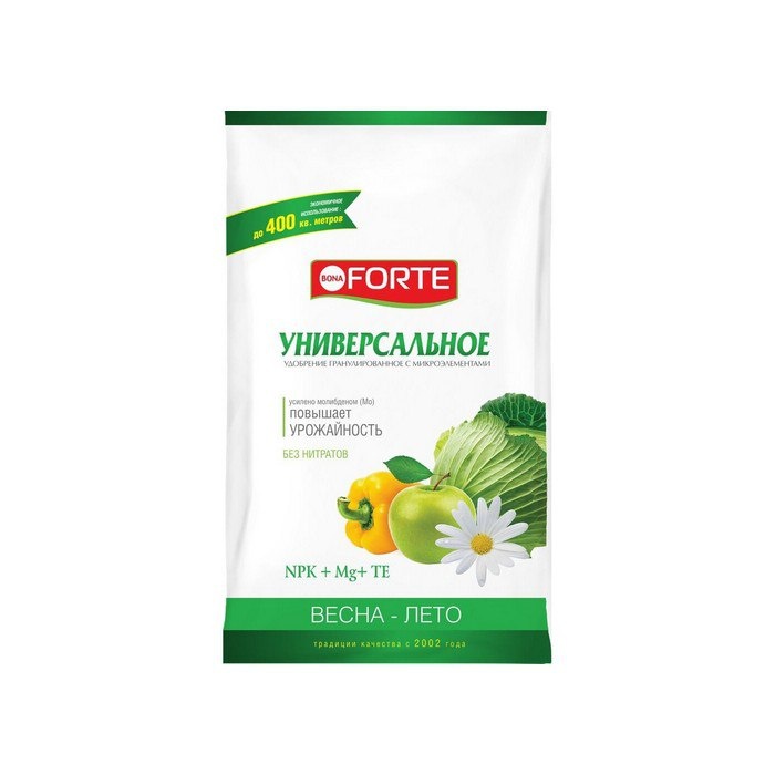 Удобрение BONA FORTE Весна-Лето универсальное (2,5 кг) — это сбалансированное средство для ухода за садовыми и огородными растениями. Оно содержит оптимальное сочетание макро- и микроэлементов, необходимых для активного роста и развития культур. Состав включает азот, фосфор и калий (по 15% каждого), а также серу (9%) и магний. Микроэлементы (бор, железо, марганец, цинк, медь, молибден) представлены в хелатной форме, что обеспечивает их максимальное усвоение растениями. Преимущества удобрения: - Улучшает структуру почвы, делая её более плодородной. - Стимулирует рост корневой системы и зеленой массы. - Повышает устойчивость растений к неблагоприятным условиям. - Подходит для основного внесения и регулярных подкормок. Одной упаковки хватает на обработку 125–400 кв.м. Произведено в России компанией "Русинхим". Удобрение фасуется в гранулах, удобных для дозирования и внесения в почву. Рекомендуется для овощных, плодовых, декоративных культур и газонов. https://emall.by/product/9297183
