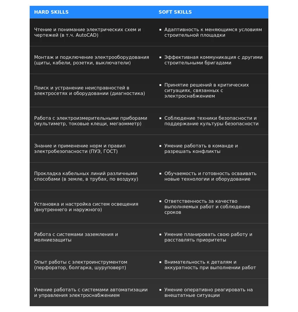 - Акцент на качества и навыки: Внимательность к деталям, ответственность, умение работать в команде, знание электротехники и техники безопасности.