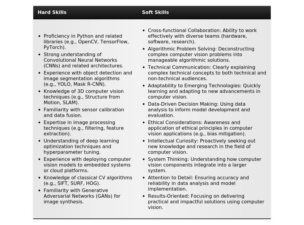 - Чрезмерная скромность:❌"Имею небольшой опыт в области computer vision."Почему плохо: Подчеркивает недостаток опыта, даже если он есть.✅"Начинающий Computer Vision Engineer, увлеченный разработкой инновационных решений на основе машинного зрения. Обладаю знаниями в области глубокого обучения, OpenCV и Python. Стремлюсь применять свои навыки для решения сложных задач в области автоматизации и анализа данных."Почему хорошо: Подчеркивает увлеченность и знания, показывает стремление к развитию.