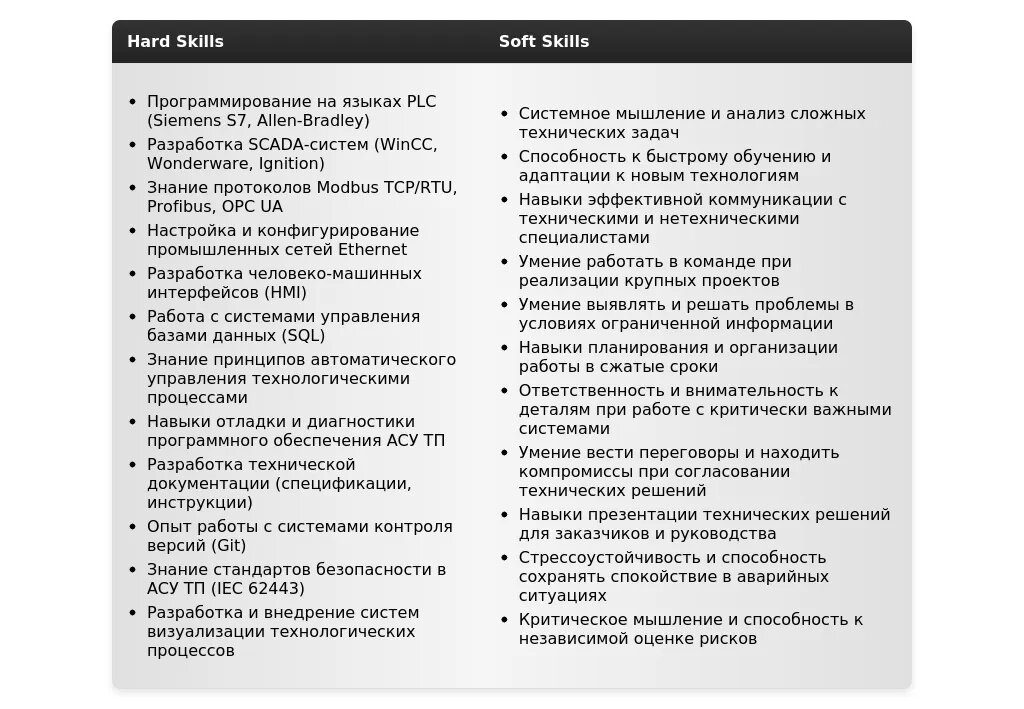 - На какие качества и навыки делать акцент: Умение учиться, аналитическое мышление, знание языков программирования, опыт работы с конкретными платформами АСУ ТП.