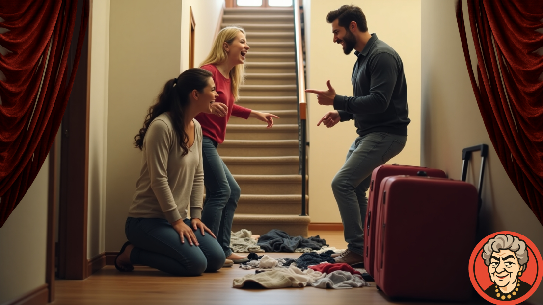 Мы взяли по чемодану и выбросили их на площадку. Один раскрылся от удара, вещи разлетелись у лифта.