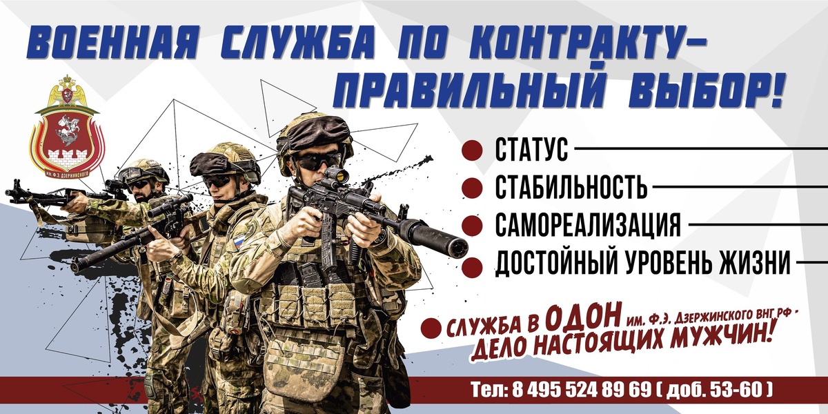 В воинских частях дивизии им. Ф.Э. Дзержинского проводится отбор кандидатов на военную службу по контракту 🇷🇺 Нам нужны: ✅Мужчины в возрасте от 18 до 45 лет готовые по своим морально-деловым качествам и состоянию здоровья к военной службе по контракту; ✅Девушки от 20 до 40 лет (медицинские работники, бухгалтера, повара, специалисты делопроизводства). Сделай правильный выбор, вступай в ряды профессионалов 🇷🇺🇷🇺🇷🇺 Подпишитесь на наши группы ВКонтакте и в Одноклассниках - читайте, смотрите и комментируйте! Источник