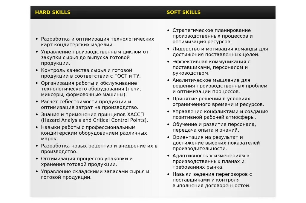 - Обязательные требования: Это то, без чего вас не допустят до собеседования. Например, опыт работы в должности заведующего производством от 3 лет, знание технологических процессов кондитерского производства, наличие профильного образования.