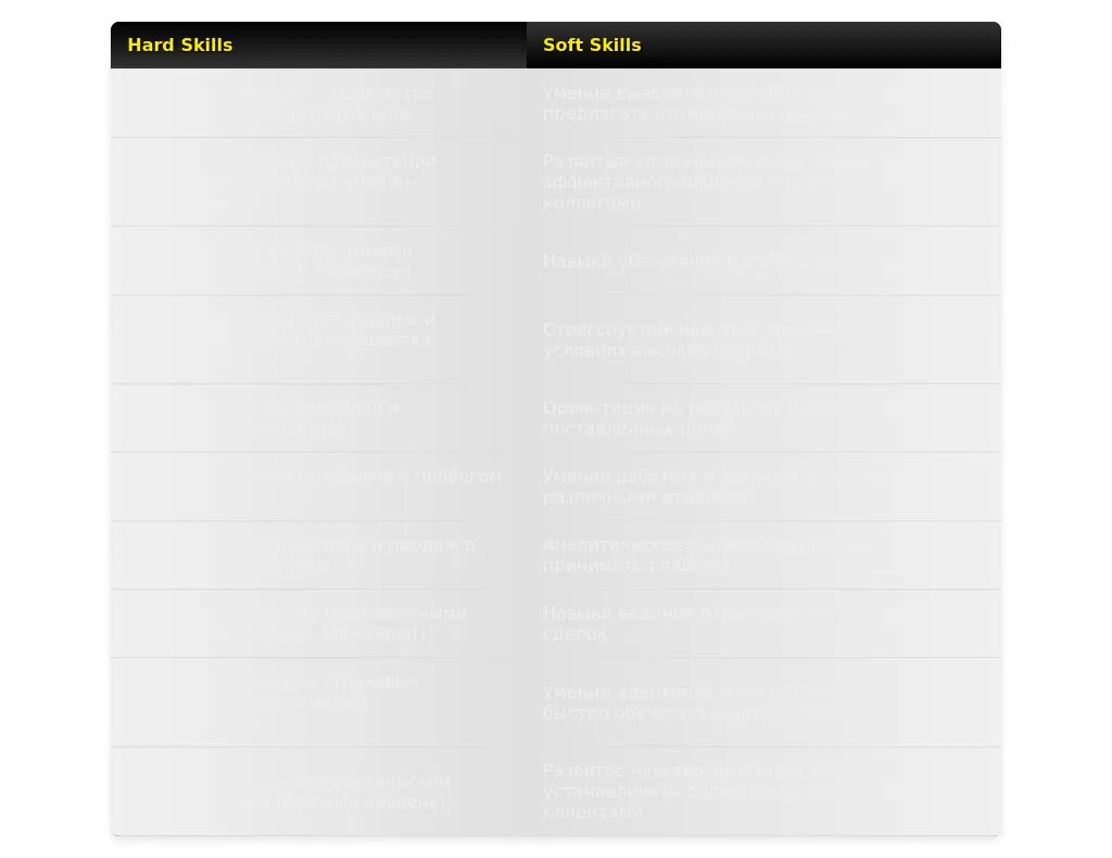 - Личные качества: Навыки, связанные с общением и работой в команде.