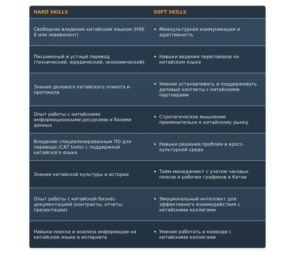 "Китайский язык (свободное владение, HSK 5), английский язык (хорошее знание), ведение переговоров, заключение контрактов, работа с CRM-системами."