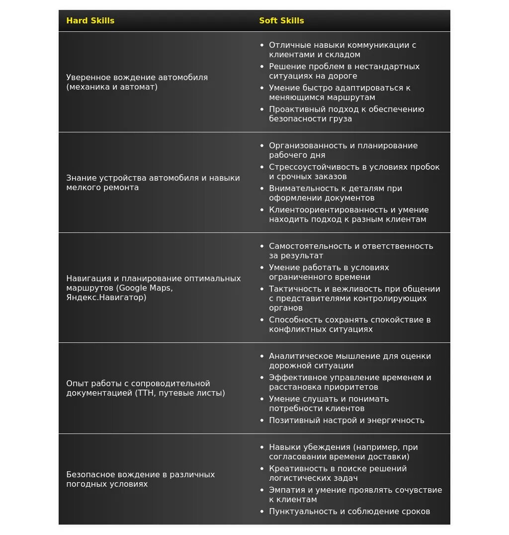 - На какие качества делать акцент: Пунктуальность, внимательность, стрессоустойчивость, хорошее знание дорог.