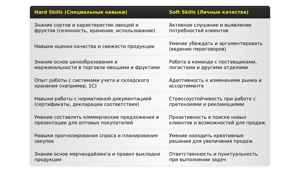 - Добавьте специализацию: Обязательно уточните, что работаете с овощами и фруктами. Это позволит рекрутеру сразу понять, подходите ли вы для данной вакансии.