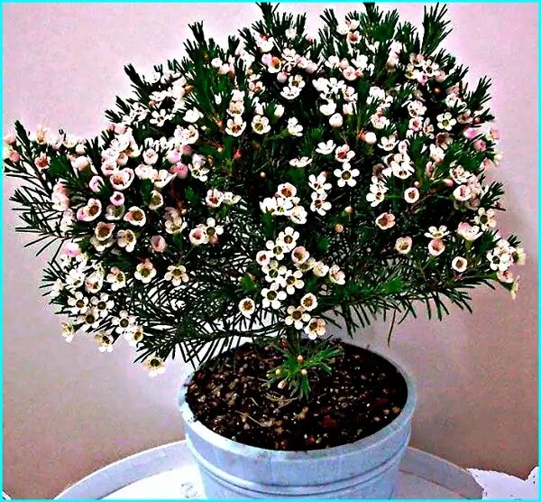 Хамелациум, или восковый цветок, поражает изяществом. Его цветки диаметром 1 – 2 см имеют уникальную восковую текстуру и разнообразную окраску: от белой и розовой до фиолетовой и красной. Они состоят из пяти лепестков и многочисленных тычинок, обильно покрывая куст с поздней зимы до весны. Листья мелкие, игольчатые (1 – 2 см), плотно расположены на тонких ветвях, создавая воздушную крону. Форма куста округлая или раскидистая.