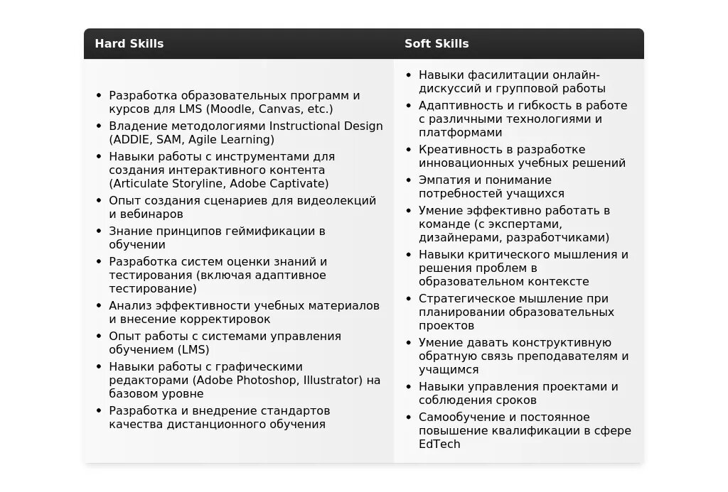 - Технические навыки: Владение LMS, системами тестирования, инструментами разработки онлайн-курсов.
