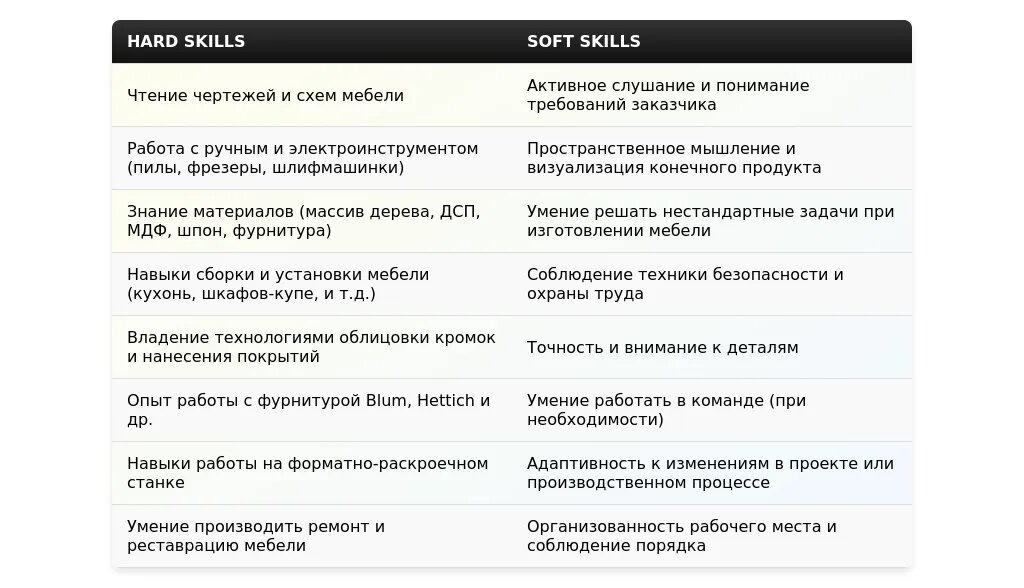 Пример 2: Адаптация раздела "Навыки" для вакансии "Мебельщик-универсал (производство мебели из массива)"