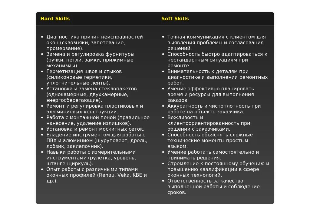 - Что обязательно включить:Ключевые навыки и компетенции, релевантные для позиции мастера по ремонту окон.