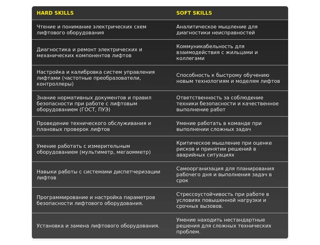 - Вахта: "Готовность к работе вахтовым методом", "обслуживание и ремонт лифтового оборудования на удаленных объектах", "обеспечение безопасности эксплуатации лифтов в условиях вахты".