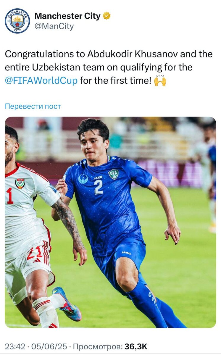 Abduqodir Husanov faoliyat olib borayotgan "Manchester Siti" klubi rasmiy sahifasi ham O‘zbekiston mundial yo‘llanmasi qo‘lga kiritgani bilan barchani tabrikladi @daryolive
