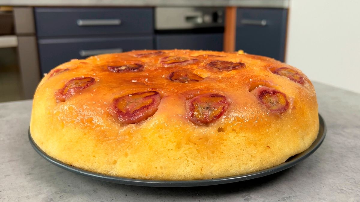 Этот рецепт пирога меня всегда выручает. Для его приготовления даже духовка не нужна. Продукты для этого пирога понадобятся самые простые — я уверена, они найдутся в холодильнике почти у каждого. Для рецепта понадобится 3 спелых банана. Разрезаю бананы сначала пополам, а потом каждую половинку разрезаю еще на 3 части. Сковородку обильно смазываю сливочным маслом, диаметр моей сковороды — 26 см. Теперь на дно сковороды высыпаю 2 столовые ложки сахара для образования карамельной корочки. Затем выкладываю бананы, но не плотно, оставляю небольшое расстояние между ними. Осталось приготовить тесто. В миску разбиваю 2 яйца, добавляю щепотку соли для баланса вкуса, 150 граммов сахара и чайную ложку ванильного сахара. Взбиваю буквально пару минут до растворения сахара — масса должна стать пышной. Добавляю 200 мл кефира. В муку (у меня здесь 300 граммов) добавляю пакетик разрыхлителя (это 10 граммов) и перемешиваю муку с разрыхлителем. Теперь добавляю муку с разрыхлителем в яичную массу и заме