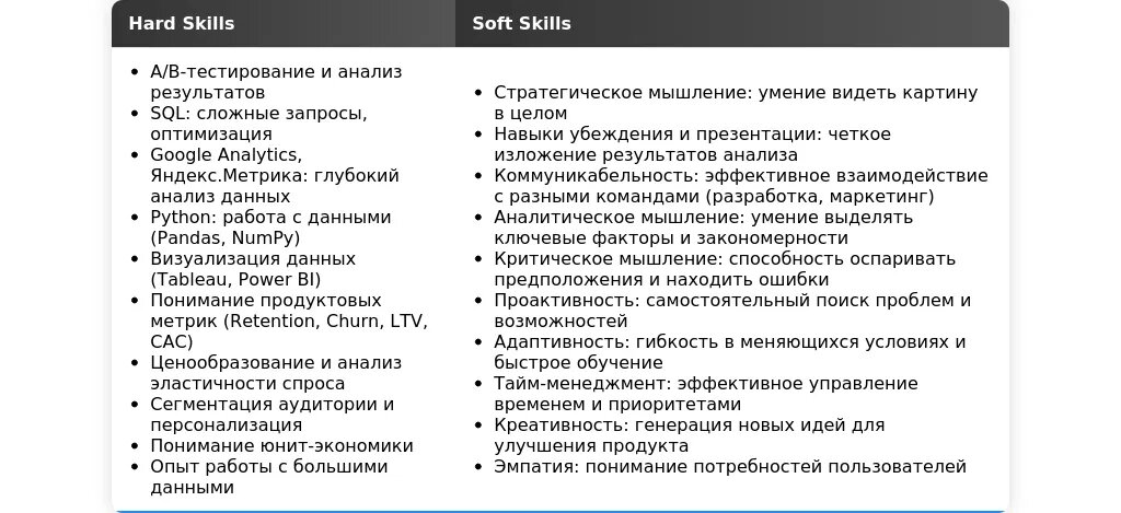- Перечислите ключевые навыки и инструменты (например, "Товарный аналитик, SQL, Python").