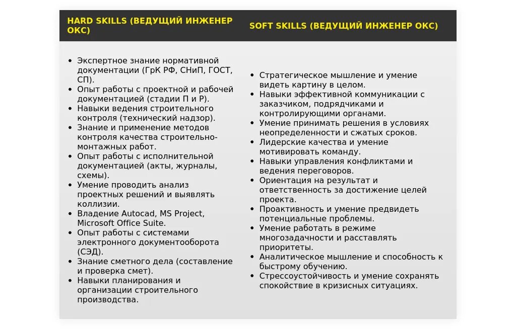 - Строительство дорог: "Знание нормативной документации в области дорожного строительства (ОДМ, ВСН)", "Опыт работы с геодезическими приборами", "Опыт работы с современными технологиями строительства дорог".
