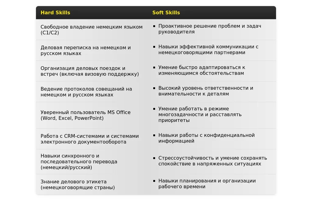 - Для вакансий, требующих знания немецкого языка: "Ведение деловой переписки на немецком языке", "Устный и письменный перевод с немецкого языка", "Ведение переговоров с немецкими партнерами", "Работа с немецкой документацией".