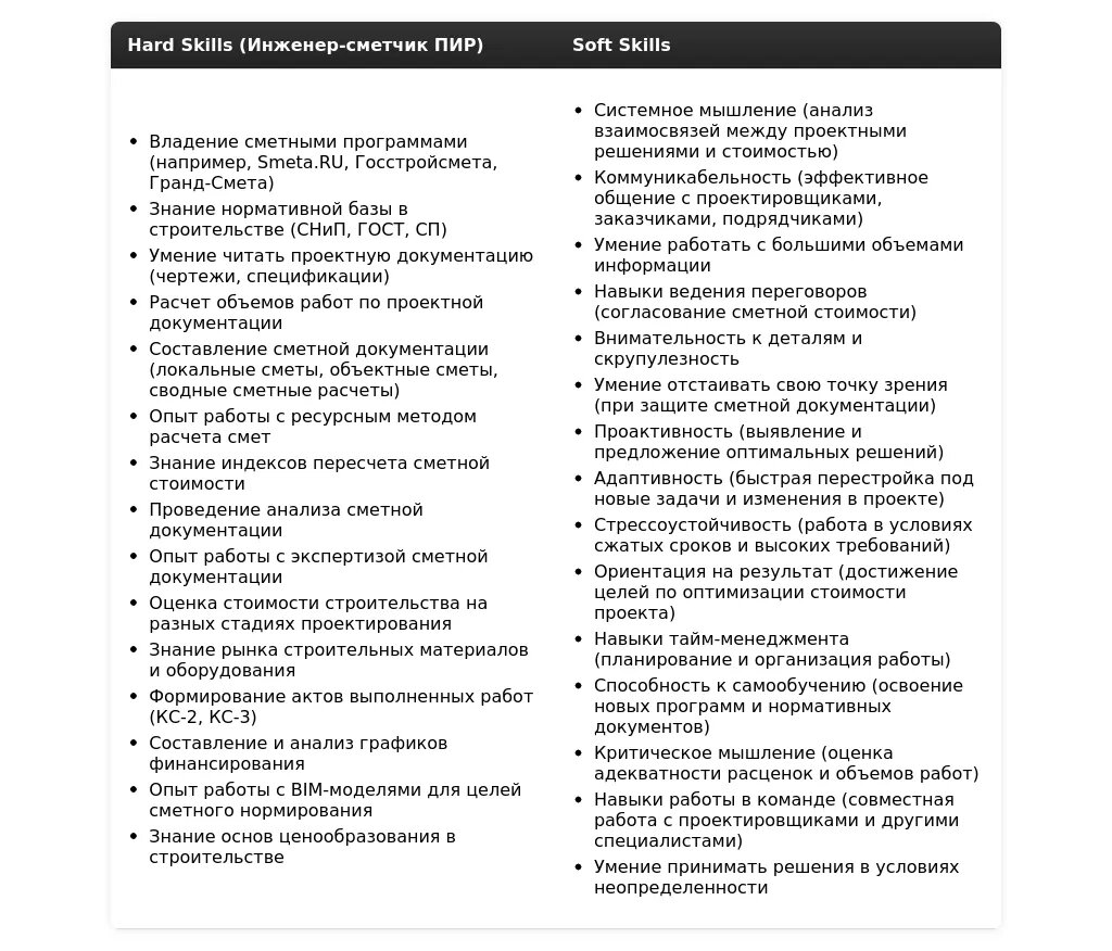 - Обязательная информация:Ключевые навыки и компетенции, релевантные для должности инженера-сметчика ПИР.