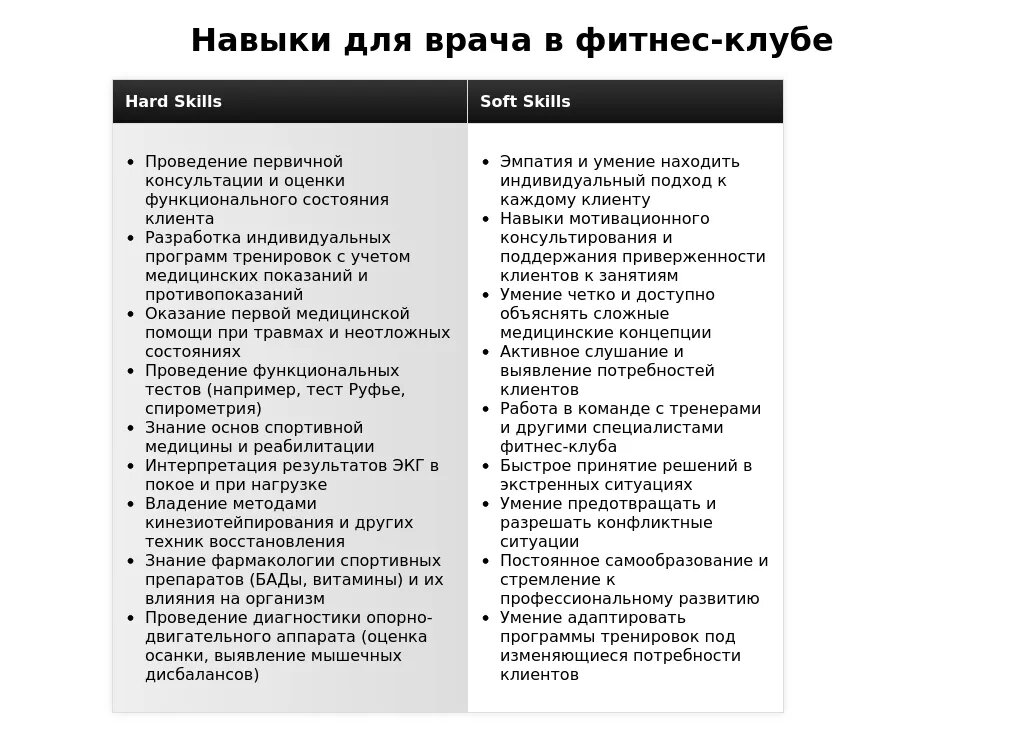- Врач-терапевт в фитнес-клубе: "Знание основ спортивной физиологии", "Опыт проведения функциональной диагностики", "Опыт консультирования по вопросам здорового образа жизни".