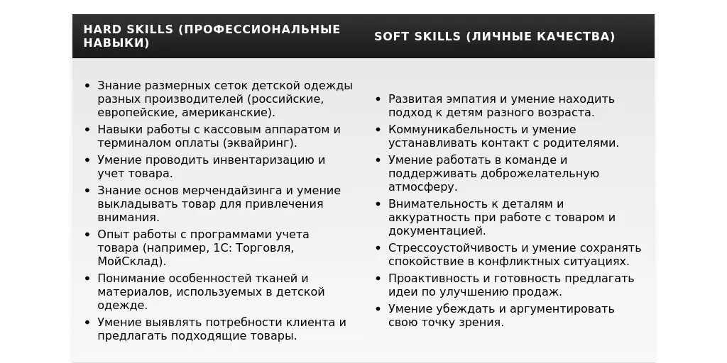 Ключевые навыки и компетенции, релевантные для позиции продавца детской одежды.
