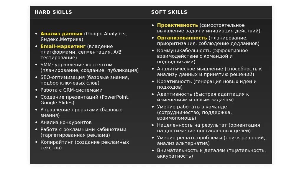 - Сгруппируйте навыки по категориям. Разделите навыки на категории (например, "SMM", "Контент-маркетинг", "Организация мероприятий", "Аналитика").