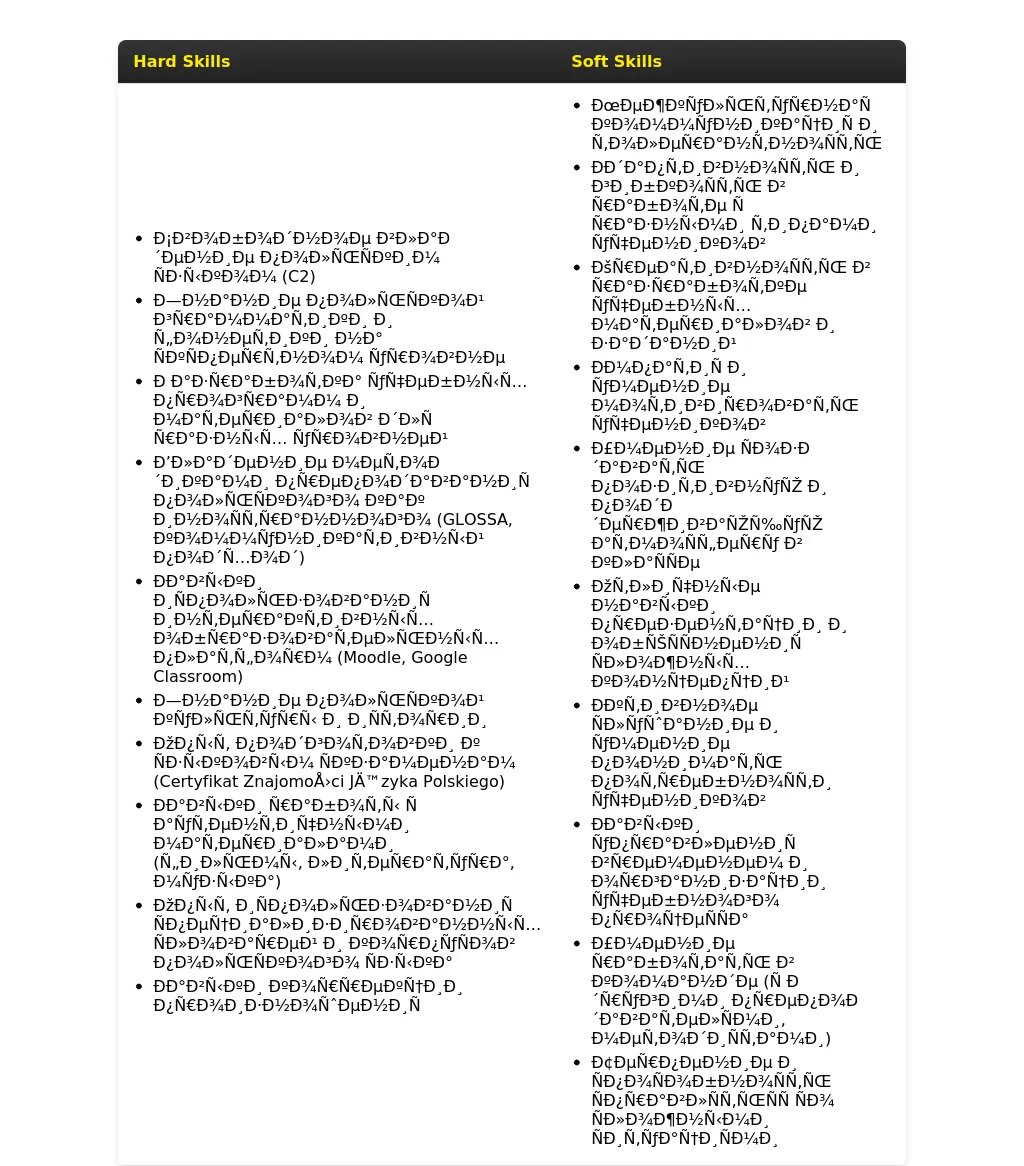 - Языковые навыки: Уровень владения польским языком (C2 – носитель), знание других языков (английский – B2).