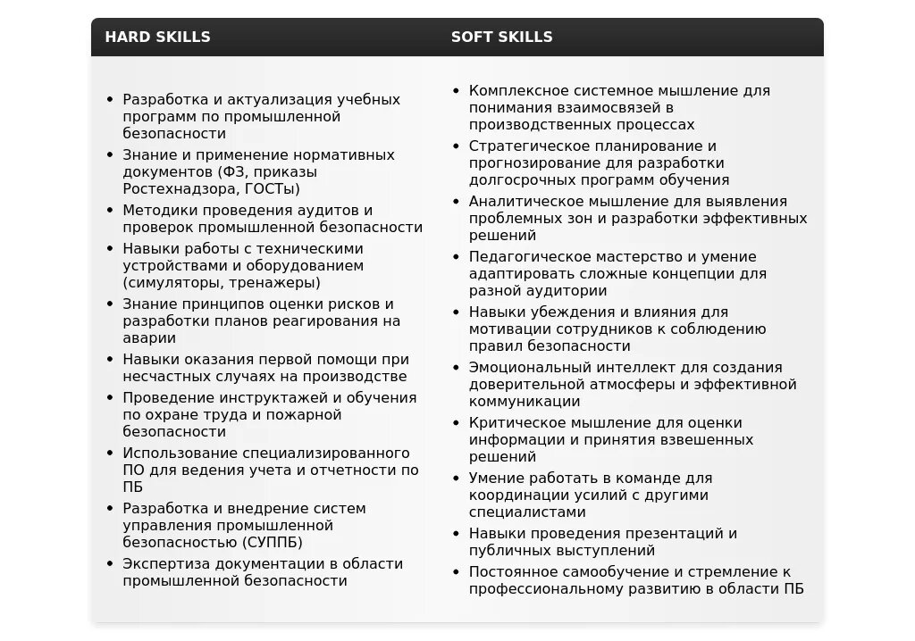- Какую информацию обязательно включить:Ключевые навыки и компетенции, релевантные для преподавателя по промышленной безопасности (знание нормативных документов, опыт обучения, методики преподавания).