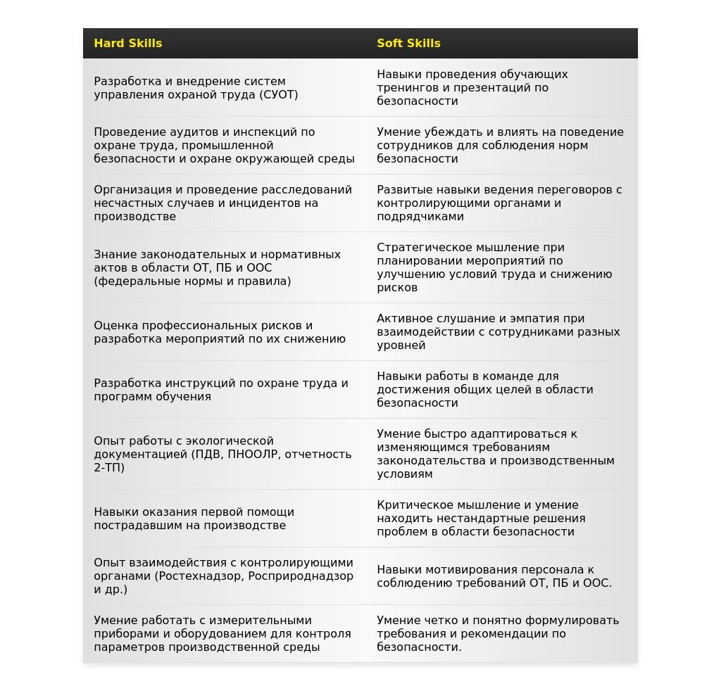 - На какие качества и навыки делать акцент: Ответственность, внимательность, обучаемость, умение работать в команде, аналитические способности, знание нормативной базы в области охраны труда и промышленной безопасности.