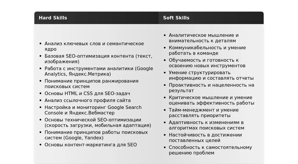 - Сгруппируйте навыки по категориям: Например, "Инструменты аналитики", "Техническое SEO", "Контент-маркетинг".