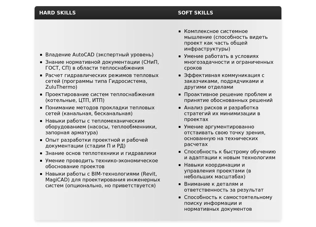 Ключевые навыки и компетенции, релевантные для профессии инженера-проектировщика тепловых сетей.